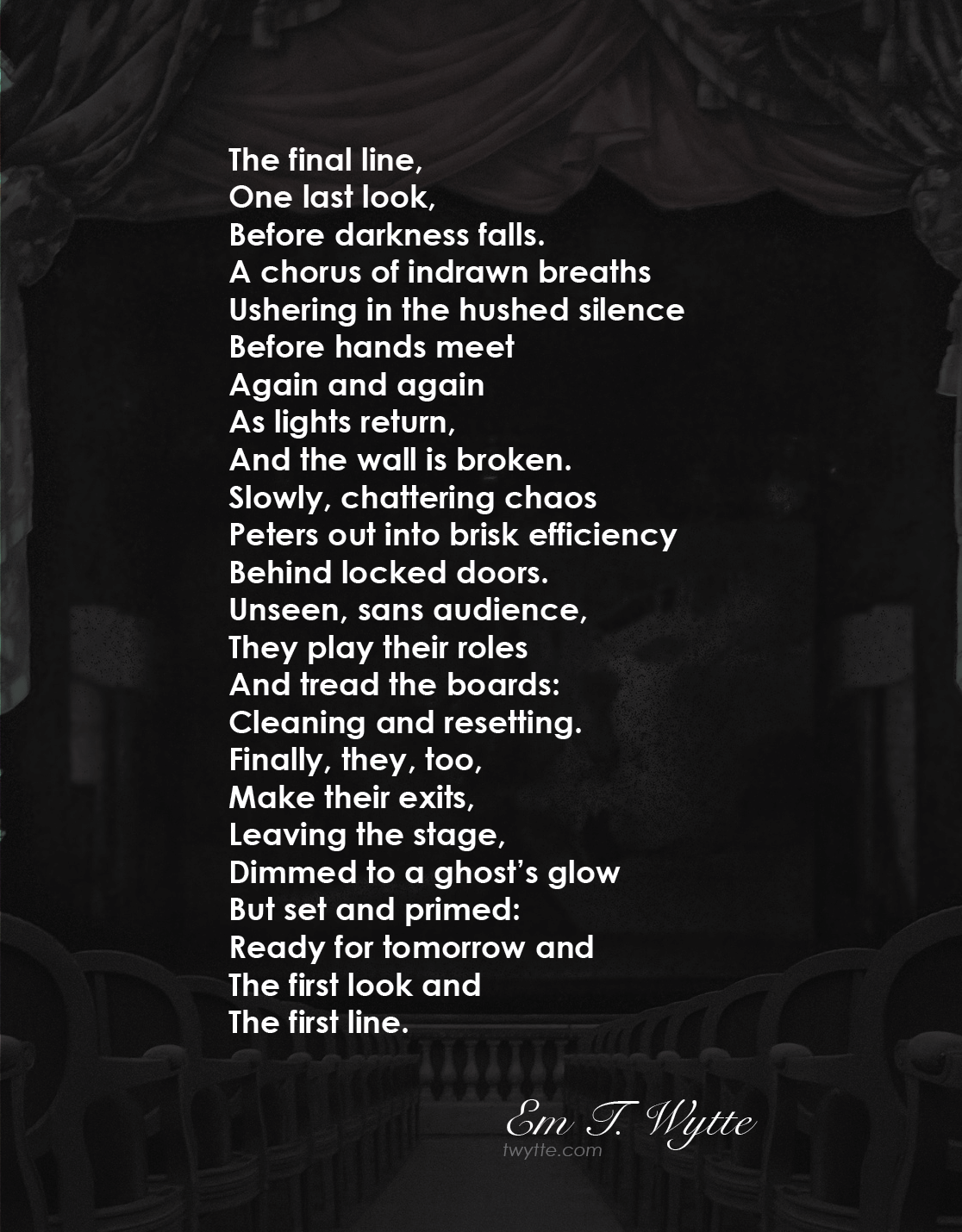 And how do you kick off the celebration at the end of a writing experiment? Write a poem! I can’t decide if that’s sadly predictable or simply in character. Regardless, I was trying to capture where the blog is now, and somehow it became theatre. I shouldn’t be surprised.